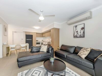 Study nook with plenty of room for a desk and bookshelf. Internal European laundry with clothes dryer. Top floor apartment with raked ceilings to the open plan living area, letting in lots of natural light. Large private balcony with sliding privacy screens. Single designated carport carpark, ample visitor parking for your visitors. Clean and modern facilities in the complex including maintained established gardens, tropical pool and barbeque area, car washing bay. Located close and handy to JCU and The Townsville Hospital – ride your bike, bus, walk, short drive.